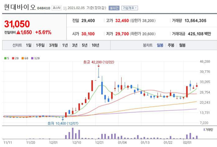 저는 주가의 급등 이유를 분석한 후 수급이 들어오는 것을 보고 2만원에 현대바이오 주식을 매입하여 3만2천원에 전량 익절한 기억이 있습니다.