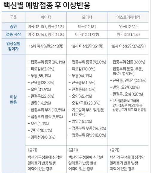 * 아스트라제네카 이상반응 - 접종부위 압통 - 접종부위의 통증 및 두통, 피로감 동반 - 근육통 및 권태감 발생 - 발열 및 오한 |