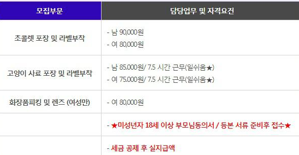 지원조건은 성별과 연령, 학력과 무관하다고 하니 누구나 포장 알바에 도전 가능하리라 생각합니다.