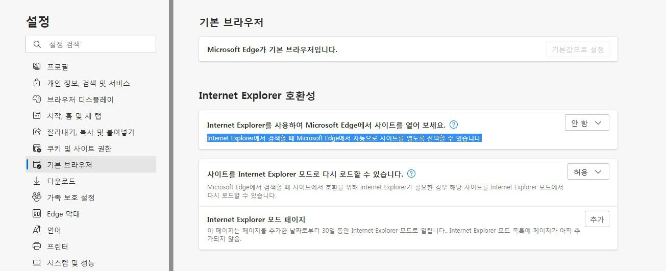 문제는 인터넷익스플로러의 사용이 중지되고 인터넷의 접속이 자동으로 엣지로 넘어가면서 발생한 문제였다.