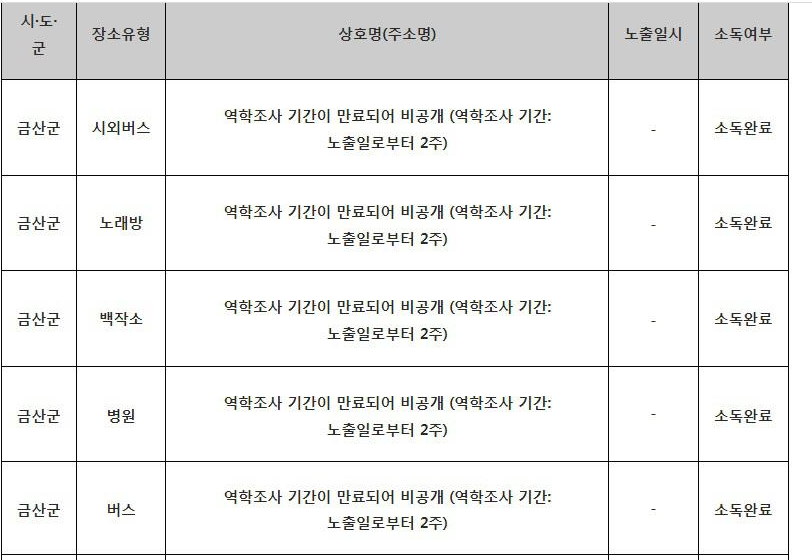 | 중앙방역대책본부 ‘코로나바이러스감염증-19 확진환자의 이동경로 등 정보공개 안내’ (공개기간)정보 확인 시 ~ 마지막 접촉자와 접촉한 날로부터 14일 경과 시(기간 경과 시 비공개) (개인정보)성별, 연령, 국적, 거주지 및 직장명 등 개인을 특정하는 정보를 공개하지 않음. 읍ㆍ면ㆍ동 단위 이하 정보는 공개하지 않음 (공개시기)코로나19는 증상 발생 2일 전부터 격리일까지 공개함(무증상 확진자는 검체채취 2일전) (공개원칙)확진자의 접촉자가 발생한 장소 및 이동수단을 공개함(가능한 범위 내에서 공간적, 시간적 정보를 특정해서 공개함) ※ 해당 공간 내 모든 접촉자가 파악된 경우 공개하지 않음(비공개 전환) ※ 개인별 이동경로 형태가 아닌 공개 범위에 해당하는 모든 장소 목록 형태로 정보를 공개함 ※ 역학조사(카드조회, 추가진술) 결과 또는 타지역 확진환자 금산 방문 시 이동경로 추가될 수 있음 코로나19 확진자가 방문하고 7일이 지난 장소에 대한 별도 소독 불필요 (코로나바이러스감염증-19 대응 지침 제10판 / '21. 5. 17.) |