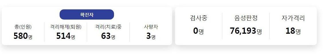 금산 코로나 확진자는 현재까지 580명, 격리해제자 514명, 격리치료자 63명, 사망자 3명, 음성판정자 76193명, 자가격리자 18명입니다.