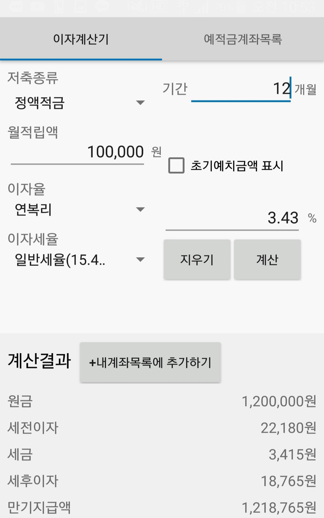 10만원을 매달 납부하니 원금 120만원 세전이자 24,173원이네요.