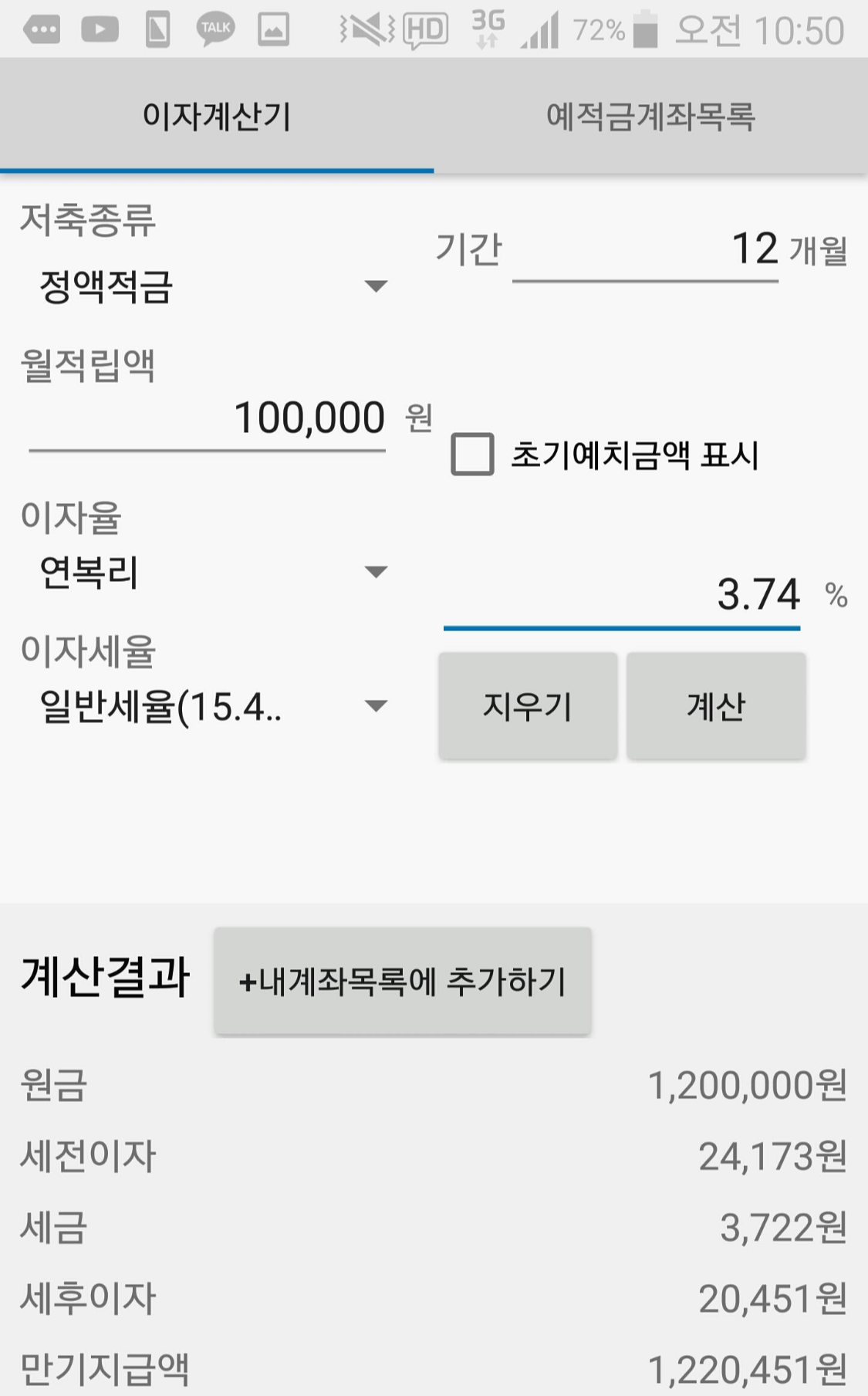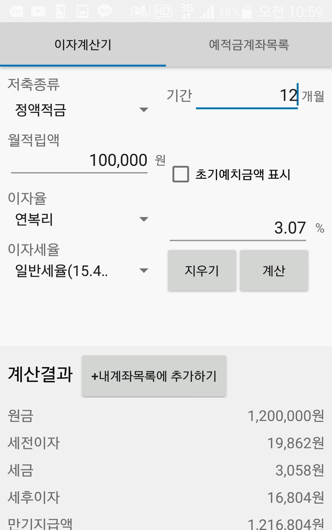 10만원을 다달이 납부하면 원금 120만원, 세전이자 19,862원이네요.