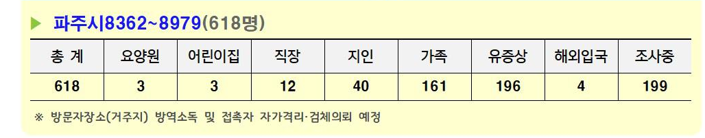 요양원 3명, 어린이집 3명, 직장에서 12명, 지인을 통해 40명, 가족간 감염 161명, 유증상 196명, 해외입국자 4명 등이 있고 그 밖에 조사중인 대상자만해도 199명에 이르고 있으니 상황의 심각성을 이해할 수 있습니다.
