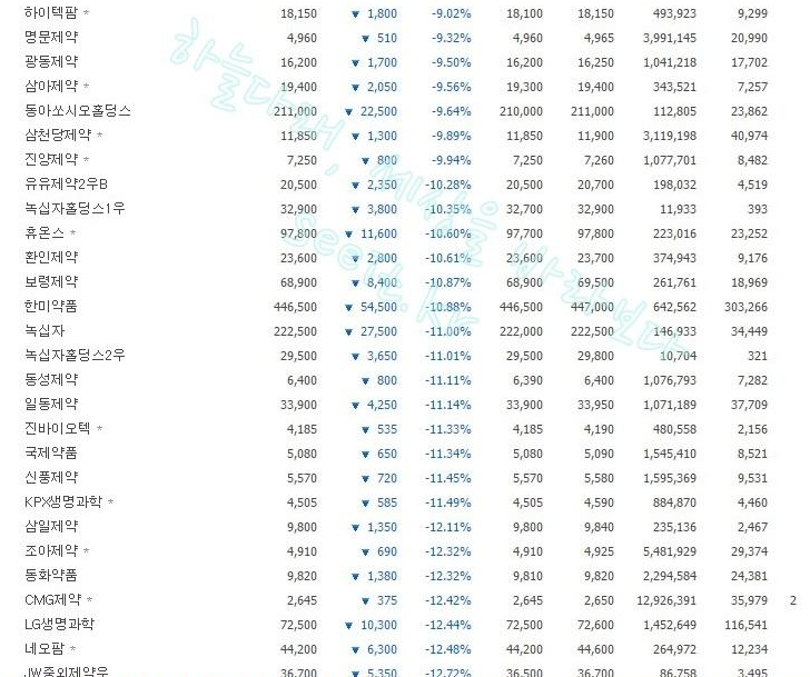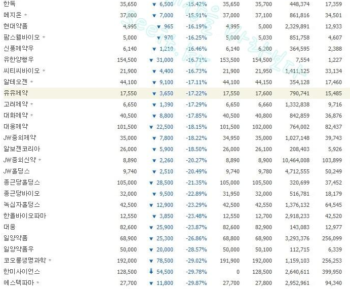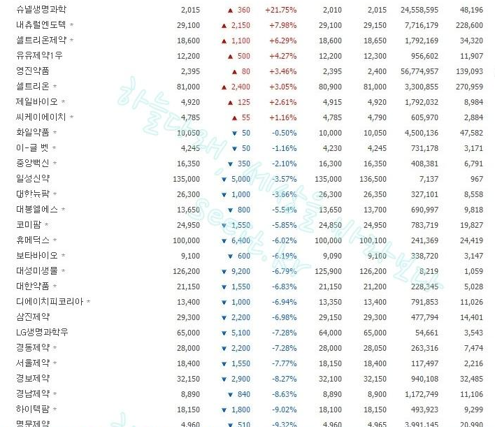 우선 2000원대 바이오주를 찾아 내기 위해 국내 바이오주의 시세를 전부 찾아보았는데요.