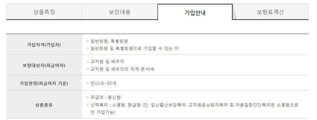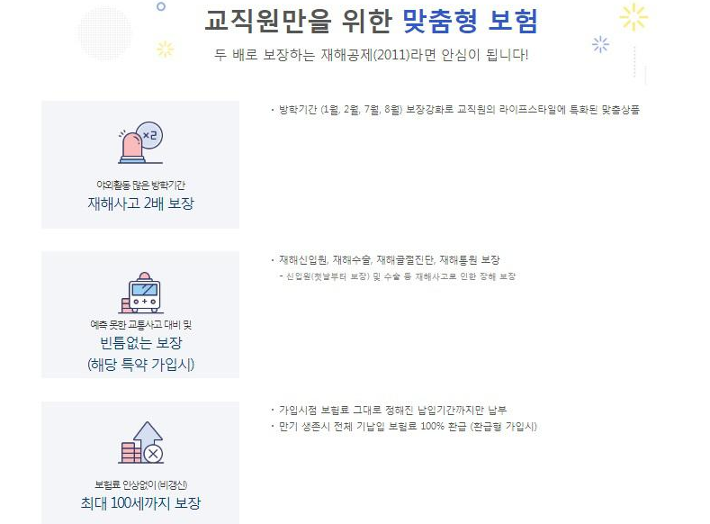 교직원만을 위한 맞춤형 보험으로 야외활동 많은 방학기간 재해사고 2배 보장, 가입시점 보험료 그대로 정해진 납입기간까지만 납부라는 항목이 눈에 띄네요.