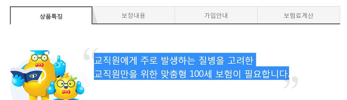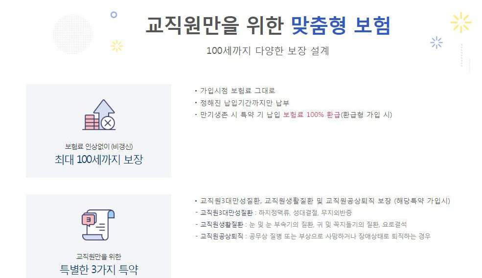 교직원에게 주로 발생하는 질병을 고려한 교직원 맞춤형 100세 보험이라는 모토로 출발하고 있는데요.