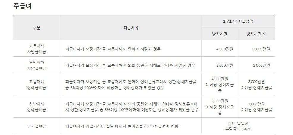 | * 유의사항 요약 1) 부담금 납입기간 중 피급여자가 장해분류표중 동일한 재해 및 이와 관련된 동일한 원인으로 여러 신체부위의 장해지급률을 더하여 50% 이상인 장해상태가 되었을 경우에는 차회 이후의 부담금 납입을 면제 2) 방학기간이란 사고발생지 표준시를 기준으로 1월, 2월, 7월 및 8월을 방학기간 외란 3월, 4월, 5월, 6월, 9월, 10월, 11월 및 12월을 의미한다. 3) 보장기간 중 "방학기간"에 발생한 재해의 직접결과에 대해 약관 제3조(급여금의 지급사유)에 해당되는 사유가 발생한 경우에는 "방학기간" 사고로, 사고발생지의 표준시 기준으로 "방학기간 외"에 발생한 재해의 직접결과로써 약관 제3조(급여금의 지급사유)에 해당되는 사유가 발생한 경우에 대해 "방학기간 외"에 발생한 사고로 구분합니다. 4) 피급여자가 보장기간 중 재해 이외의 원인으로 사망하였을 경우에는 사망당시의 책임준비금을 지급하고 이 계약은 소멸된다. |