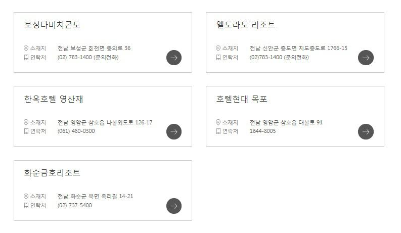 총 5개의 숙소 및 호텔이 있으며 교직원공제회 호텔명은 보성다비치콘도, 엘도라도 리조트, 한옥호텔 영산재, 호텔현대 목포, 화순금호리조트 호텔이 있습니다.