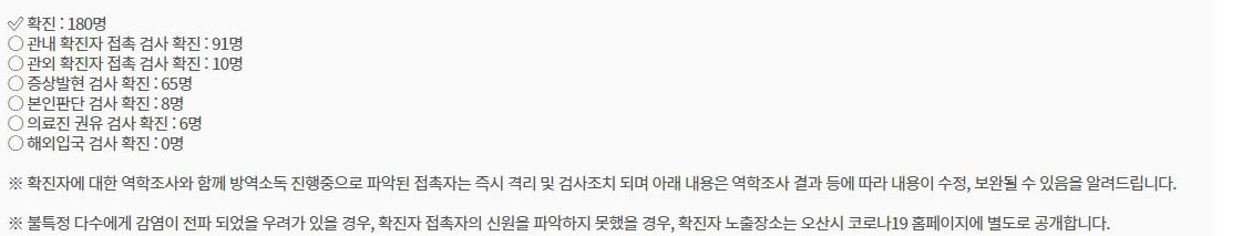 | ✅ 오산의 어제 확진자 : 180명 ○ 관내 확진자 접촉 검사 확진 : 91명 ○ 관외 확진자 접촉 검사 확진 : 10명 ○ 증상발현 검사 확진 : 65명 ○ 본인판단 검사 확진 : 8명 ○ 의료진 권유 검사 확진 : 6명 ○ 해외입국 검사 확진 : 0명 |
