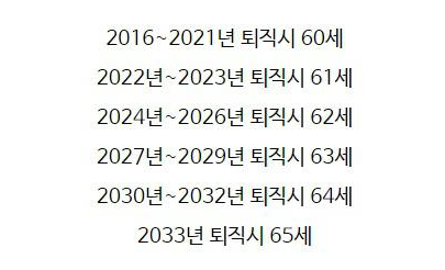 보다 정확하게 말하자면 2021년도 퇴직자, 2023년도 퇴직자, 2026년도 퇴직자, 2029년도 퇴직자, 2032년도 퇴직자, 2033년 이후 퇴직자로 구분되어 지급개시연령이 바뀌게 된다.