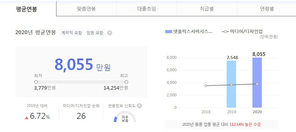 넷플릭스서비시스코리아(유)의 평균연봉은 2020년 기준 8000만원이 넘네요.