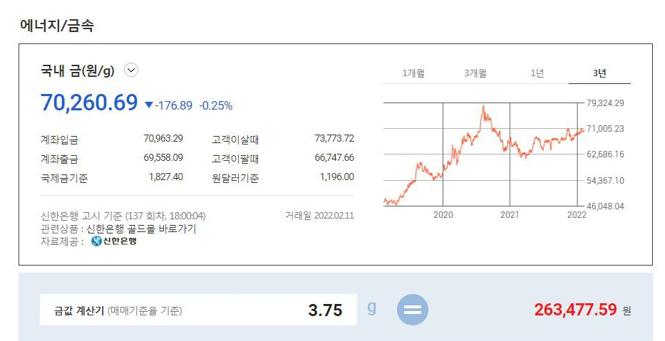 금시세 그래프를 확인한 결과 1돈의 가격이 263,477.59원이라는 사실을 확인할 수 있습니다.