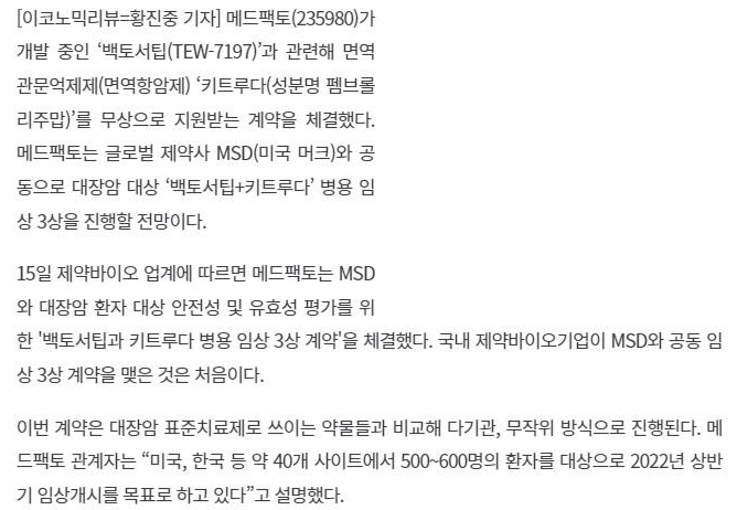 향후 메드팩토는 대장암 환자 500명 이상을 대상으로 백토서팁(면역세포의 암세포 공격을 방해하는 신호물질)의 임상 3상을 진행한다고 공시했다.