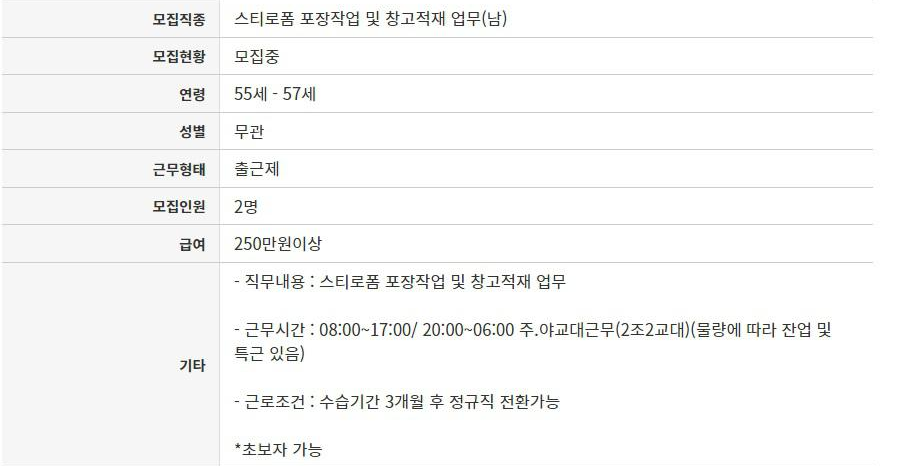 모집 직종이 스티로폼 포장작업 및 창고적재 업무이니 어르신들이 하시기에도 신체적으로 크게 어렵지는 않습니다.