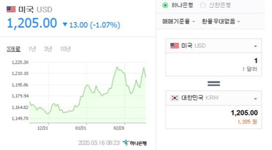오늘의 시세는 1USD (달러) = 1,205.00원입니다.
