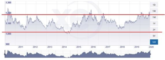 2014년 전후로 1010원정도까지 하락한 적이 있었고 1200원을 넘어섰을 때 다시 하락하는 현상을 반복했네요.