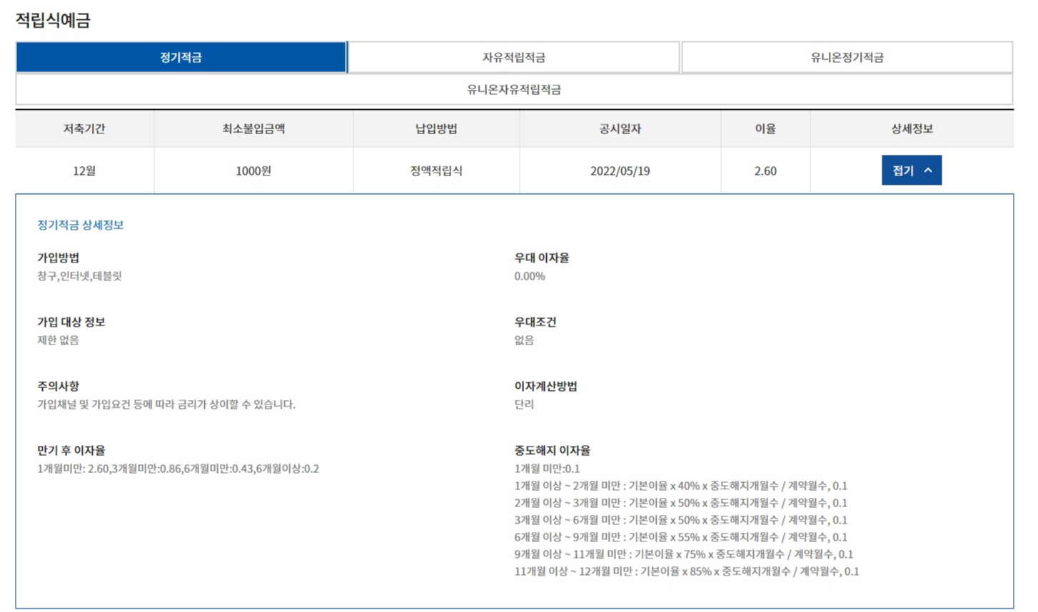 적립식예금은 정기적금, 자유적립적금, 유니온 정기적금이라는 게 있는데 일반적으로 적금을 생각하면 된다.