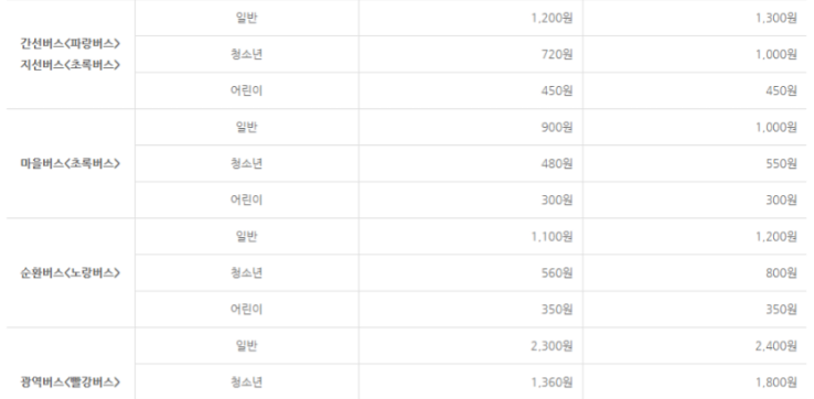 서울 시내버스 일반 청소년 어린이 요금이 등급별로 몇 백원의 차이가 발생하는 것을 알 수 있습니다.