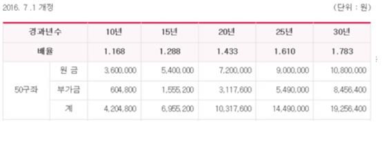 연배율제는 총 납입원금에 납입기간별 연배율을 곱해 원리금을 계산하는 방식으로 간단하게 말하면 납입기간이 길어지면 년마다 곱해지는 이율이 높아졌습니다. 마치 아래의 방식과 같습니다.
