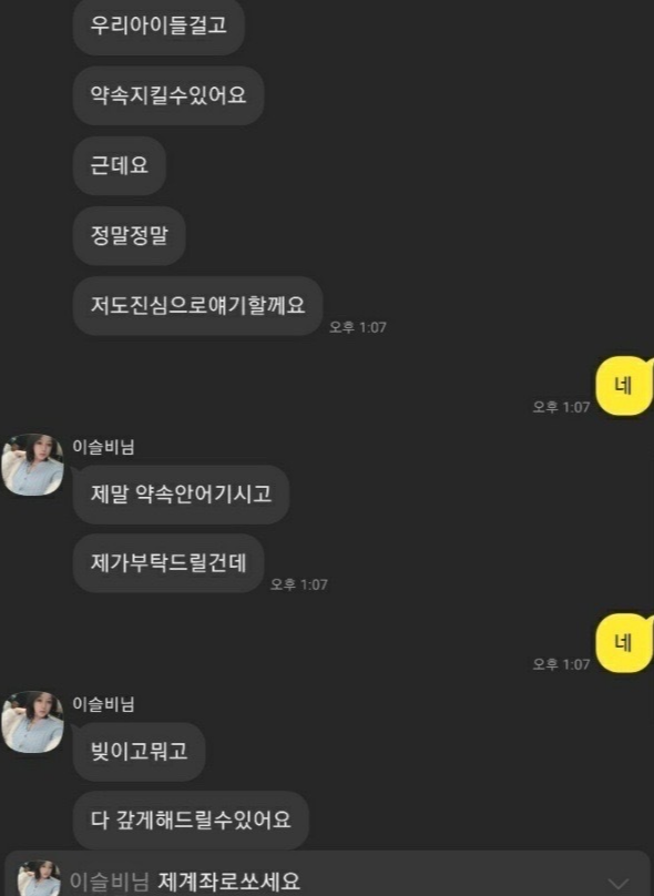 하지만 심리학을 전공한 내 입장에서 보면 진실성이 상당히 부족해 보인다고 평가되는게 아이들 걸고, 정말 저도 진심으로 , 빚이고 뭐고 다 갚게 해드린다 이런 표현들은 사실 상대편을 현혹하는 진부한 표현이라고 본다.