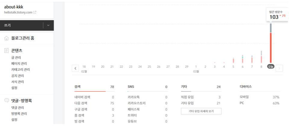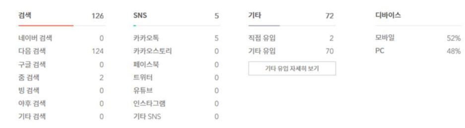 네이버 검색이 0입니다. 이 상황을 두 가지로 해석할 수 있을 것 같습니다. (나는 다음의 사랑을 독차지하고 있다) 어떻게 보면 한계가 느껴지기도 하지만 긍정적으로 해석하자면 새로운 거대한 시장이 아직도 제게는 존재한다는 것이겠네요. 그리고 제가 sns를 카톡 말고는 하지 않는 관계로 이외 유입자는 전무합니다. 기타 유입에서도 직접유입이 생기기 시작했고 기타 유입도 많아졌습니다. 기타유입의 의미가 제 카테고리에서 여러 글을 읽는 게 맞나요? 아무튼 긍정적인 신호라고 해석하고 싶습니다.