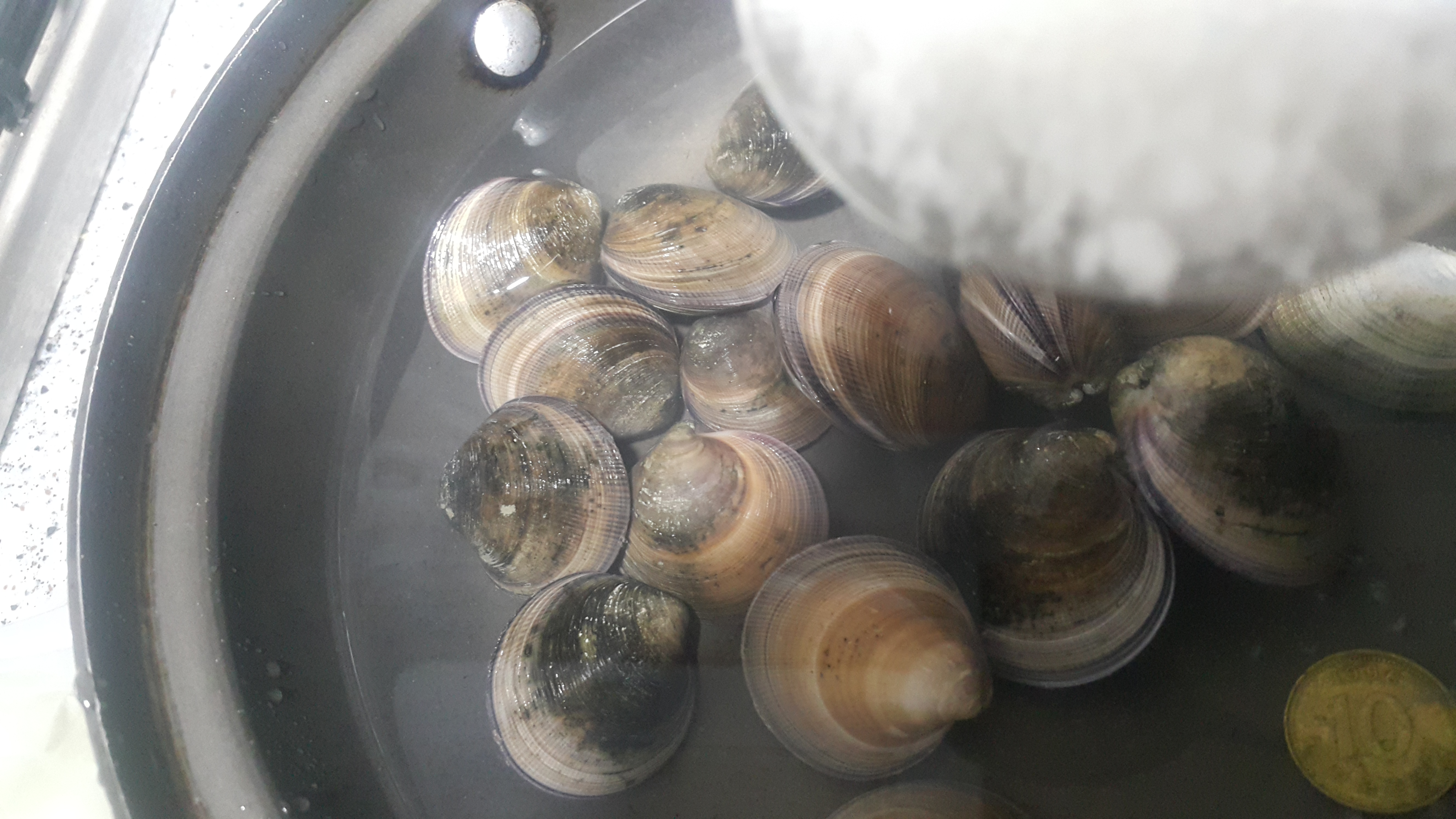 해감을 위해 반드시 알아야 할 사항은 4가지입니다. 첫 번째 소금을 넣어야 합니다. 농도는 바닷물과 비슷한 농도로 맞춰지도록 미리 소금을 물에 타보고 짭짤할 정도로 만들어야 합니다. 우리가 3~4인용 라면을 끓여먹는 냄비 하나 정도의 사이즈라면 보통 소금 3 스푼정도의 양이 적당합니다.