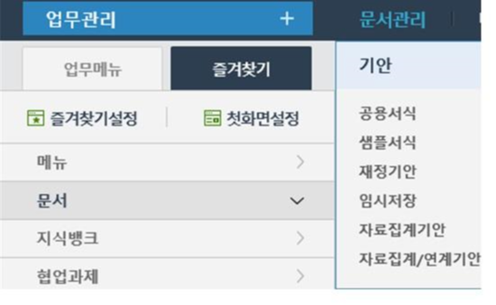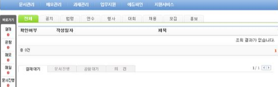 업무관리는 예전의 업무관리시스템에서 진행하던 일반적으로 우리가 사용하는 업무(각종 계획 및 보고 등)를 기안 및 처리하는 부분입니다.