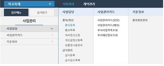 예전에는 업무관리 시스템에서 지출 품의도 했었지만 요즘은 지출에 관한 품의는 학교회계를 통해 이루어지는 것으로 변화되었습니다.
