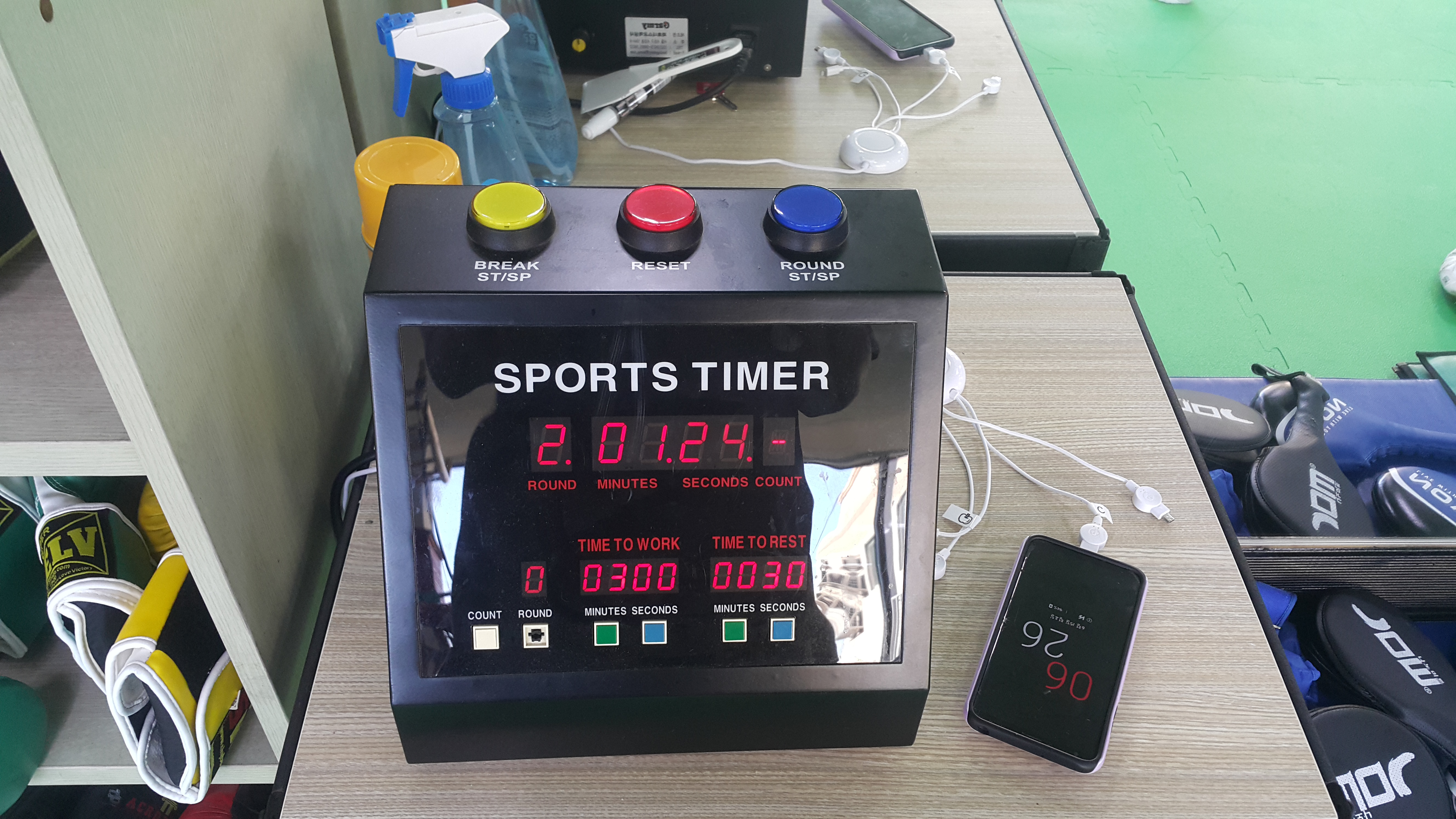 공포의 벨입니다. 3분의 운동과 30초의 휴식이 반복적으로 울려대는데 거기에 맞춰 줄넘기나 기본 동작 및 각자의 수련을 모든 사람이 하게 되는 마법의 종입니다. 3분씩 3라운드로 처음에 줄넘기할 때는 너무 고통스럽고 힘들었는데 지금은 제법 편안해진 것 같습니다. 처음에는 10개도 간신히 했는데 지금은 100~200개 정도는 할 수 있는 것 같아요. 체력이 엄청 좋아졌음을 느끼죠.