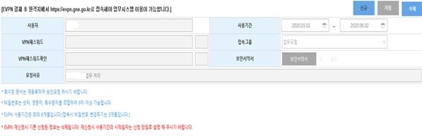 신규를 선택하면 비활성화되어있는 부분이 활성화됩니다. 그리고 vpn패스워드를 입력한 후에 vpn패스워드 확인을 한번 더 입력해서 비밀번호가 다르지 않은 지 확인하는 절차가 따릅니다. 요청 사유는 각자 부서별 업무를 적으시면 됩니다. 교무부 학적업무처리와 같이 입력하시면 됩니다.